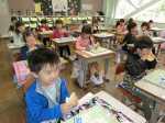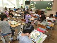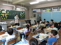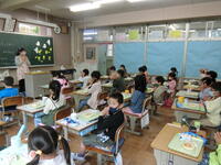 2年生国語「きょうのできごと」の学習です。単元の最初の時間は、みんなで学習の計画を立てました。「今日はどんなことをしたかな?」という先生の発問に、「ひなんくんれんがありました」「ドッジボールで遊んだよ」「あやとりをしました」など、自分の考えを進んで発表したり、書いたりしていました。この単元では「今日の出来事をくわしく日記に書いて、読んでもらう」という活動を行います。どんな日記になるか今から楽しみです。