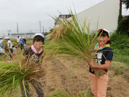 本校では地域の農園をお借りして、5年生は苗植え体験・稲刈り体験をしています。