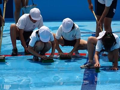 更衣室やプールサイド、プールの中など一生懸命掃除しています。