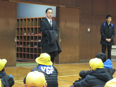 2月の講話朝会を体育館で行いました。校長講話では、「節分にまつわる鬼について」と「体育館脇の築山について」話しました。その後、主幹教諭より、2月の生活目標「廊下の荷物を整頓します」について話しました。