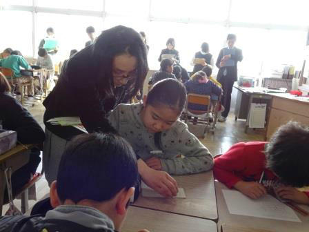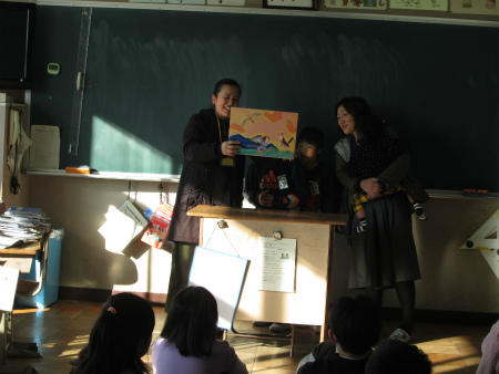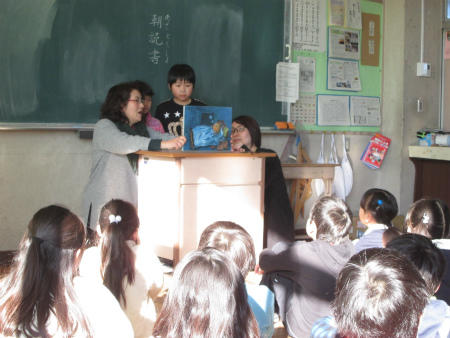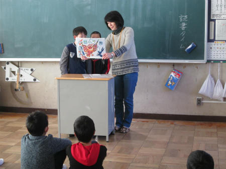 読み聞かせボランティアyomuyomuのみなさんにが、昼休みの時間を利用して、英語の紙芝居を見せてくださいました。英語も流暢で、ペープサーとも準備され、本格的な内容でした。