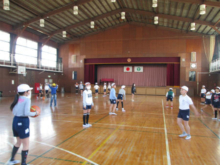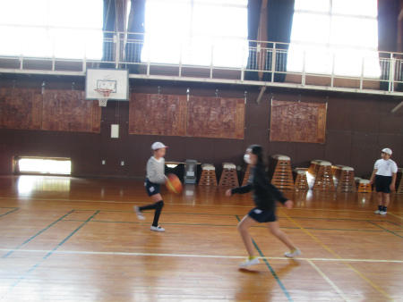 5年1組の子どもたちが、4時間目に、体育館で、体育の授業を行っています。バスケットボールの単元です。小グループで、パスとドリブルを組み合わせた練習です。ドリブルをしながらパスを出すタイミングと相手を考え、パスをします。声を掛け合って、学びあい、教え合って、技能を高めています。
