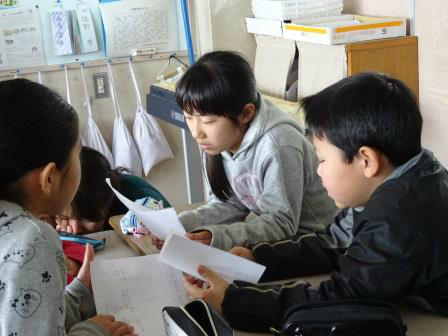 2年1組で、算数科の校内授業研究会を行いました。「分数」の単元で、「分数を用いるとものを半分や四半分にした大きさを表せることを知り、日常生活の中で分数を用いる能力を身につけられるようにする。」ことを学習しました。子どもたちは、まず一人で学び、次にグループで協同し、さらに一人で学習したことを確認します。どの子も課題に向けて意欲的に学習していました。