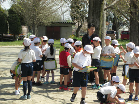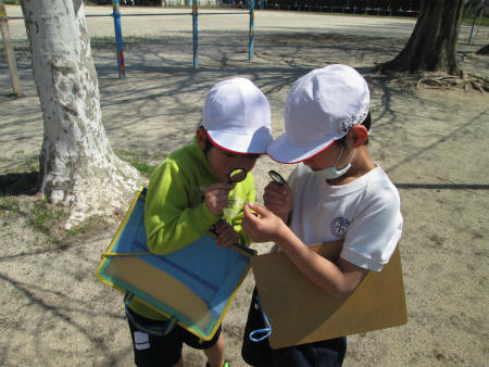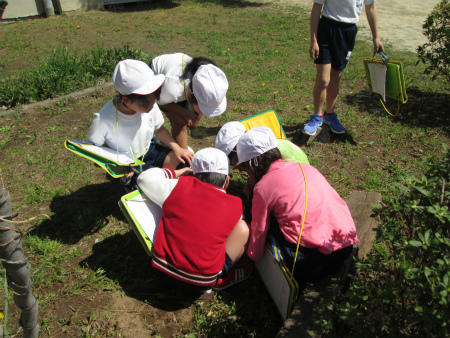 3年生の子どもたちが自然環境豊かな本校校庭で、理科の学習に取り組んでいます。春の生物を探しているようです。モンシロチョウを追いかける子、ベニシジミを捕まえ観察する子、ダンゴムシを見つけた子など、楽しい活動をもとに学習を進めていました。