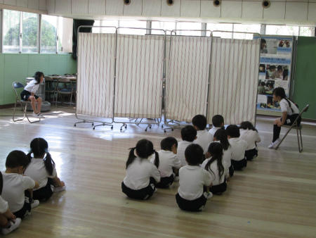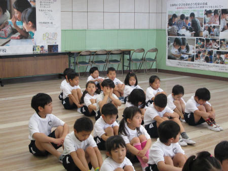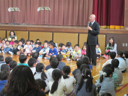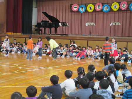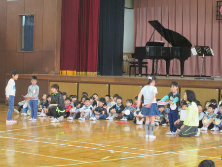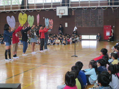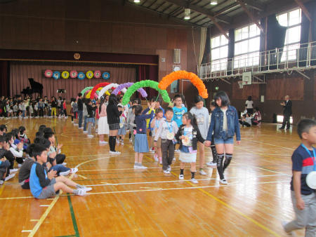 先日、入学したかわいい1年生を迎える会を体育館で行いました。2年生から6年生までが準備をし、今日の日を迎えました。1年生の子たちは、6年生と手をつなぎ、にこやかに入場してきました。心のこもったプレゼント・歌・発表などに1年生の子たちもにっこり。明日からも元気に登校してください。