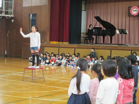 5時間目の後、音楽集会を行いました。昨年度までは、朝行事として行っていましたが、日課表の改善により午後になりました。本日はその第1回目です。子どもたちは、離任式の歌を思いを込めて歌うことができました。5月2日の本番が楽しみです。