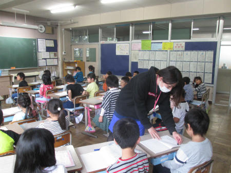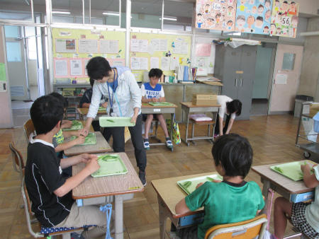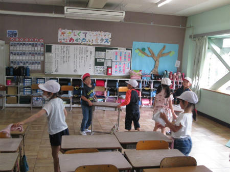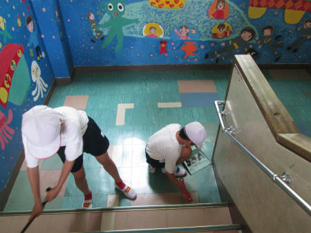 昼休み後、子どもたちは清掃活動に取り組みます。低学年の子どもは助け合いながら、高学年の子は分業で手分けをしながら、進めています。子どもたちの働きで、学校がきれいになりました。