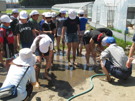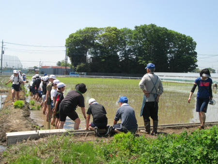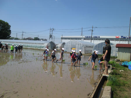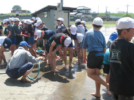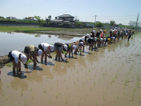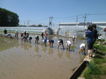 昨日の曇天が嘘のように晴れ渡った空を背景にして、5年生の子どもたちとボランティアの皆さんが田植え体験に出発しました。田んぼに到着後、早速、田植えの方法や手順を指導していただき、田植えを開始しました。まっすぐに張った綱を目安に、一列に並び、腰を曲げ、苗を植えていきました。作業体験が終わった後は、愛情たっぷりおにぎりが待っています。楽しみですね。