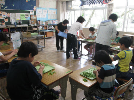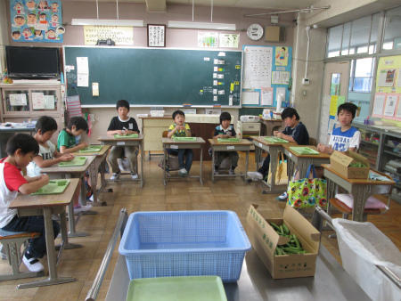 本日の給食の献立は、わかめ入りグリンピースご飯、あじフライ、おかひじきのサラダ、牛乳です。その、グリンピースご飯に使用するグリンピースの皮を1年生と5・6組のみなさんがむいてくれました。お話を聞いて、しっかりむくことができました。どんなおいしい給食になって出てくるのか待ち遠しいですね。
