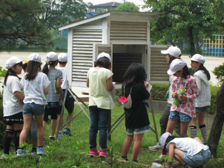 職員室前の百葉箱付近から子どもたちの声がします。行ってみると、4年生の子どもたちが理科の教科書を見ながら、学び合っています。どうやら、晴れの日の気温の変化について学習しているようです。どんな学びに発展したのでしょう。