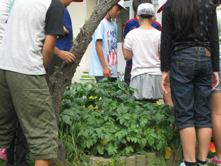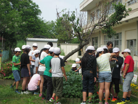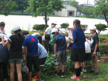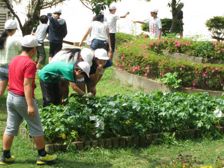 6年生の子どもたちが理科の学習で職員室前にやってきました。ジャガイモの様子を見ています。銀色の紙を持っている子もいます。日差しを気にしている子もいます。どうやら、ジャガイモの葉と銀色の紙を利用して光合成についての実験を行っているようです。どんな実験結果がでるか楽しみですね。