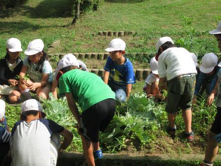 3年生の皆さんがキャベツの植わっている花壇の除草作業にやってきました。除草作業をしながら、キャベツの葉についているモンシロチョウの幼虫や糞を見つけていました。隣の夏ミカンの木の実やアゲハチョウの幼虫に興味を持つ子もいました。いよいよ、蝶博士の学習の時期になってきたようです。