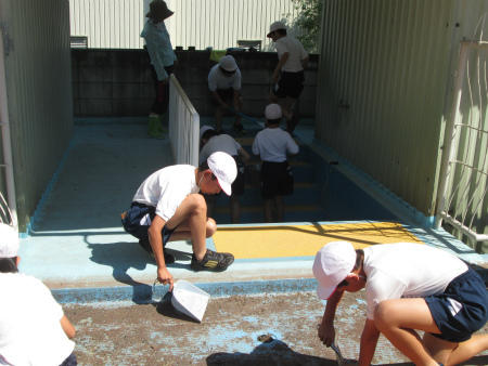 本日は、5年生・6年生の皆さんが朝から、プール清掃を行いました。先週からプールの水を抜き、たまっている落ち葉やどろ等を取り除き、きれいにしています。みんなが楽しくプール学習を行うためには、きれいにする仕事をするお兄さん、お姉さんがいたことを忘れないようにしましょう。