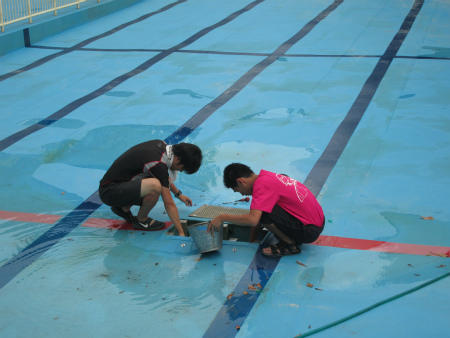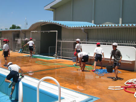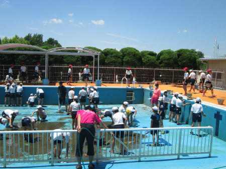 午後は職員の作業でプール清掃を完全なものにし、終了させます。事故防止のために、排水溝のチェックもします。さあ、プール学習が待ち遠しいですね。