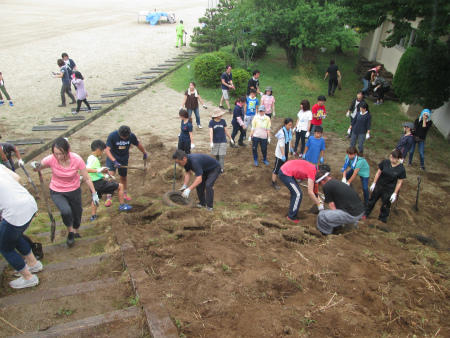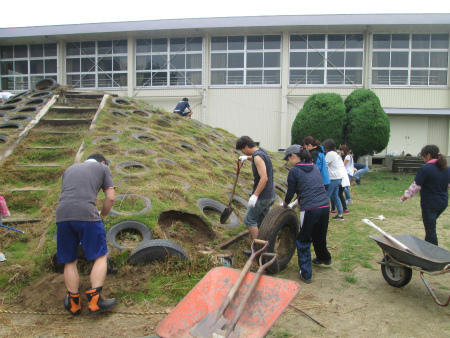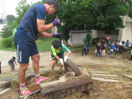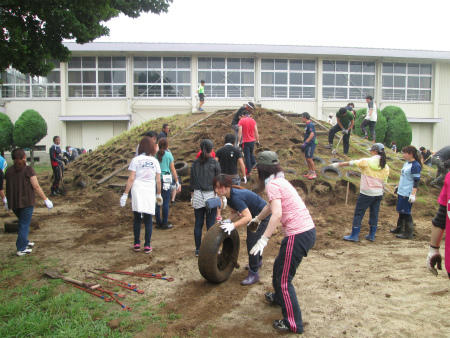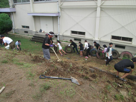 本日は、懸案になっていた「なかよし山の改修作業」を行いました。小雨が時折降る曇り空の中、PTAの有志、お父さんの会のメンバー、そして子どもたちの代表が、力を合わせ、「タイヤ撤去」と「側溝清掃」に取り組みました。大変な作業にもかかわらず、和気あいあいと仕事は進み、少し早めに完了しました。ありがとうございます。この後、専門家に山の整形をしていただき、8月19日の除草作業時に、「タイヤセット」と「階段つけ」を行います。ご協力宜しくお願いします。