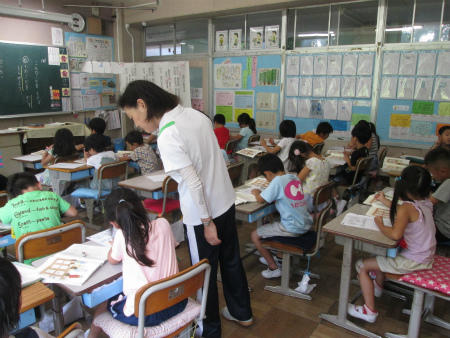 本日は、2時間目に1年2組の国語の授業参観を行いました。「こんなことをしたよ」という作文の書き方の学習でした。どこに題名を書くのか、名前を書く場所はどこなのか、先生と一緒に考え、プリントに書き込むことが出来ました。