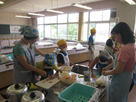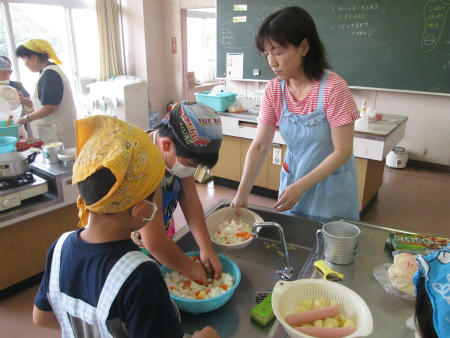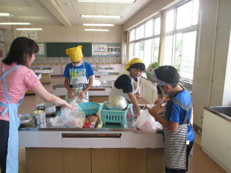 本日は、家庭科室で、5・6組のみなさんが調理実習を行いました。しっかりと身支度をし、野菜やソーセージを上手に切りました。さて、どんな料理が出来るのでしょう、楽しみですね。