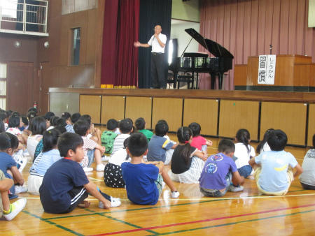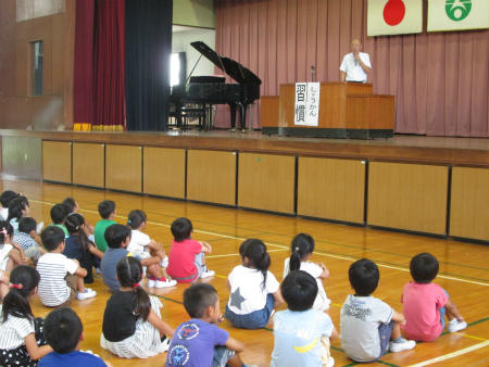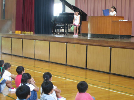 引き続いて、第1学期終業式を行いました。まず、児童代表の言葉を2年生と4年生の子どもが発表しました。1学期の反省と成長に向けての考えがよく述べられていました。次に、校長より、夏休みに向けて、習慣の大切さについてお話がありました。どの子もしっかり聞くことが出来ました。最後に、夏休み中の生活について、生徒指導主任より安全安心に関わる重要な指導を行いました。