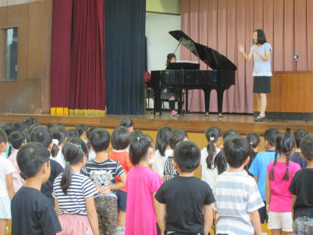 本日は、音楽集会の前に学生さんの紹介を行いました。共栄大学の3年生の3人が教育実習として4週間、1年生2人がふれあい体験として8日間、子どもたちと共に学びます。宜しくお願いします。今月の音楽集会では、運動会に向けて、「校歌」と「ゴーゴーゴー」を練習しました。大きな歌声が体育館に響き渡りました。