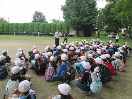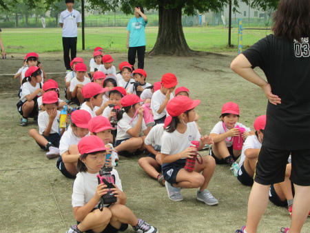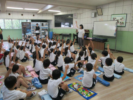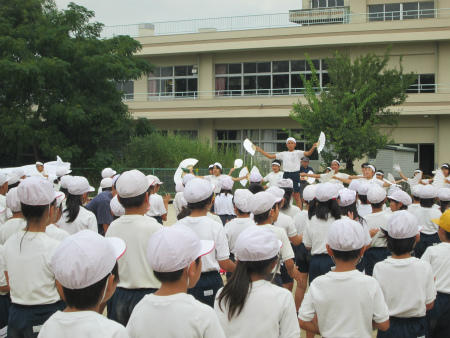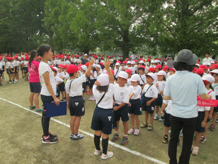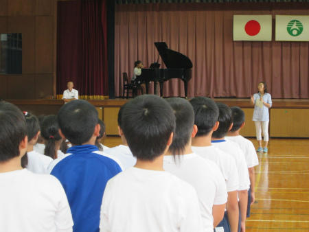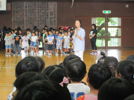本日は、音楽集会の前に学生さんの紹介を行いました。共栄大学の3年生の3人が教育実習として4週間、1年生2人がふれあい体験として8日間、子どもたちと共に学びます。宜しくお願いします。今月の音楽集会では、運動会に向けて、「校歌」と「ゴーゴーゴー」を練習しました。大きな歌声が体育館に響き渡りました。