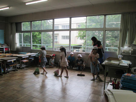本校では、昼休みの後、清掃が行われます。まず、一階の階段掃除は6年生が手際よく少ない人数できれいになるようにやっていました。二階は、2年生のフロアです。2年生は掃除の基本を一つ一つ習得しながら協働して行っています。どの子も一生懸命、清掃に取り組んでいました。