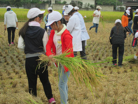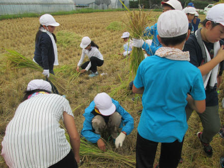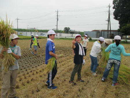 昨日に予定されていました稲刈り体験ですが、本日実施できました。子どもたちは、春に自分の植えた苗が大きく成長したことに驚いていました。早速、稲刈りの方法を教わり、体験を開始しました。体験後には、おいしいご褒美に大満足の1日となりました。付き添っていただいたボランティアの皆様、現地で協力していただいたボランティアの皆様、実習用の田んぼや器機を貸していただいた上にご指導いただいた皆様に大変感謝いたします。