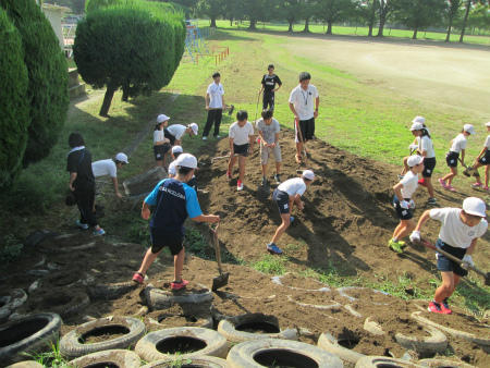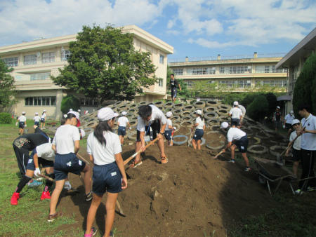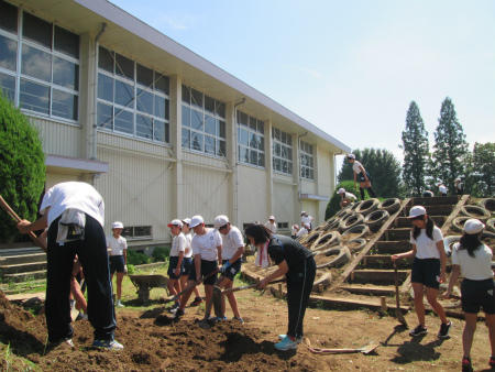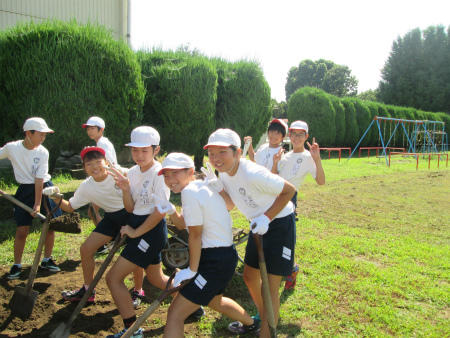 久しぶりの青空の中、6年生が「なかよし山の改修作業」を奉仕活動として行いました。例年3学期に行っていた奉仕活動ですが、今年は「なかよし山の改修作業」の最終段階を最上級生である6年生にお任せすることにしました。子どもたちは、1時間目から、3組、2組、1組の順で作業を進めていきました。担任や大学生を含め、同じ時代を生きていく仲間たちと協力して、「なかよし山の改修作業」という大事業を完成させる経験はよい思い出になることでしょう。
