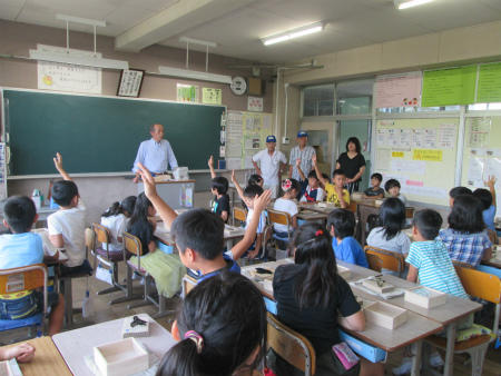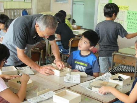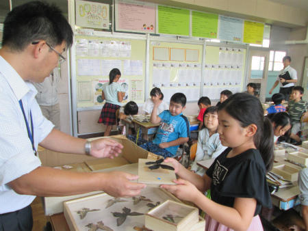 本日は、3年生が楽しみにしていた「蝶の標本作り学習」を行いました。春日部市役所、春日部市教育委員会、報道機関の皆様にお越しいただき、倉松川を愛する会の皆様の全面的な支援のもと、思い出に残る授業が進められました。春に一人一頭ずつ採取した蝶を展翅し、形を整えて保管していました。本日は、その蝶を春日部特産の桐箱に収納し、学習成果をまとめました。思い出に残る標本と地域ボランティアの皆さんのやさしさが子どもたちの宝物となった一日でした。ご協力いただいた皆様、大変ありがとうございました。