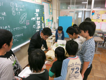 小林先生は、ヒイラギから、葉脈を取り出す授業をしていました。子供たち一人一人が集中し、歯ブラシを使ってきれいな葉脈を作っていました。そのあとの観察図では、自分で仕上げた葉脈を見て、正確に表現していました。