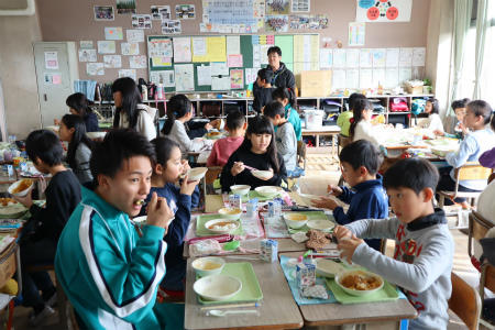 高校生のお兄さん、お姉さんとの給食の様子です。子供たちも楽しそうです。