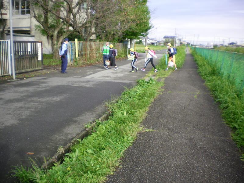 今朝は、春日部警察署の警察官や職員の方とスクールガードリーダーさんが校門付近で登校指導を行ってくださいました。