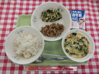 今日の献立は、かきまわし、牛乳、味噌カツ、春キャベツのおひたし、甘夏ゼリーです。