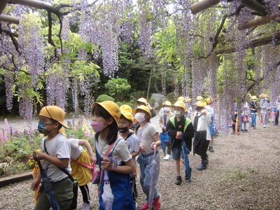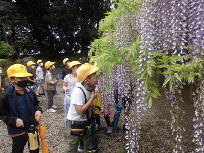 子供たちは、今が見ごろな藤の花を目でもにおいでも
