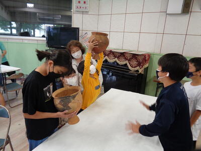 子供たちは、実際にナベ(土器)を持たせてもらい観察しました。