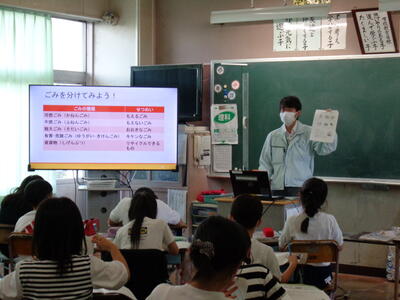 春日部市役所の環境政策課の方が来てくださり、ごみの分別の仕方や3R(リデュース、リユース、リサイクル)について学びました。