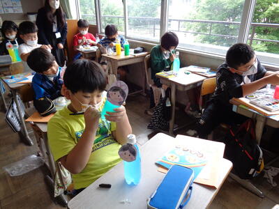 ペットボトルに好きな色の絵具を入れ、色水を作ります。