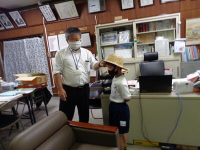 「これは、麦わら帽子だよ。かぶってごらん。」