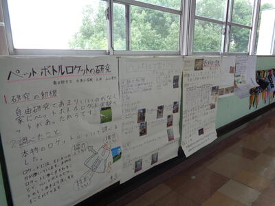 今年度から、理科の自由研究に限らず、自分の好きな分野の研究をしてよいことにしました。「リニアの動力実験」「ダイオウイカの研究」「ホットケーキ名人になろう」「プロレスの歴史」「Mcdonald'sポテトは、どのサイズがお得?」「俺流釣竿を作ってみた」などおもしろい研究がたくさんありました。