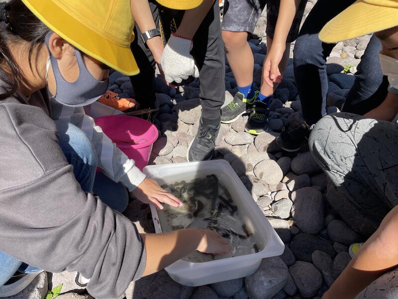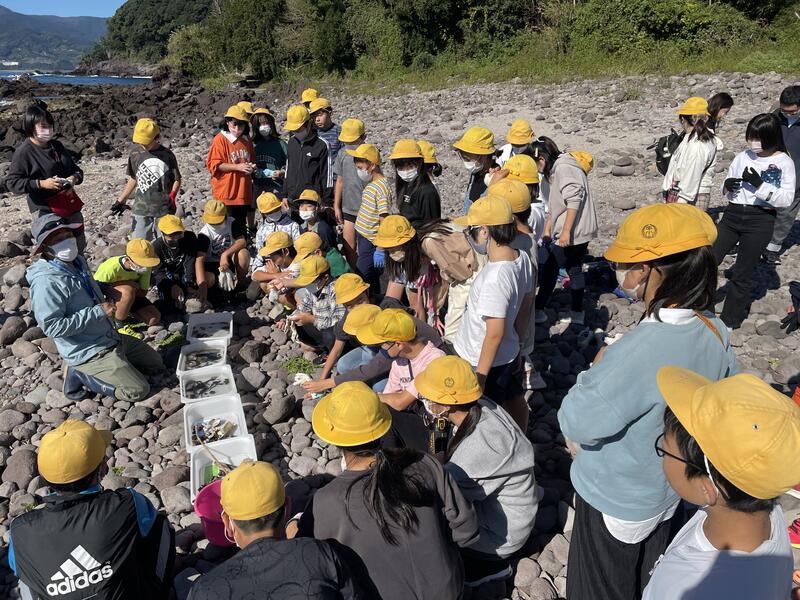 真鶴海岸の岩場を中心に、ビーチコーミングを行いました。カニやナマコなどの生き物をはじめとして、貝殻や木の実などの漂着物をみんなで採りました。