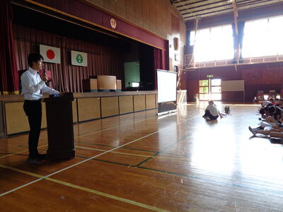 本日6校時に体育館で5年生児童と保護者の方々に向けて林間学校説明会を行いました。