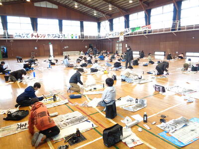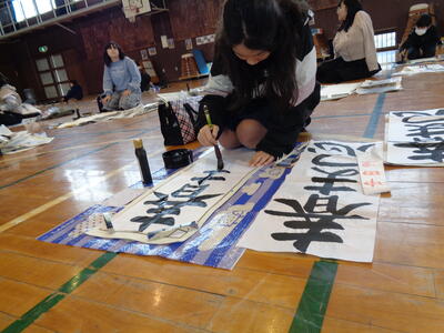 朝から非常に気温が低く、体育館は特に寒い状態でしたが、子供たちは集中して筆を走らせていました。