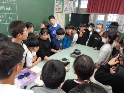 みんな安全メガネをしながら、蒸発皿の水溶液が蒸発していく様子をドキドキしながら観察していました。
