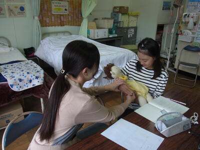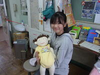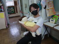 保健室の赤ちゃん人形を抱っこして抱き方を教えてもらいました。赤ちゃんは首が座らないのでしっかり首をささえるんだよ。