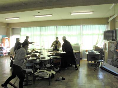 不審者対応避難訓練を行いました。学校に不審者が侵入した際の対処について春日部警察署地域課の3名の警察官の方に指導をしていただきました。教員は、①教室に侵入した不審者を児童から離す②児童を他教室に避難させる③応援が来るまで児童のいるところに行かせない。(間に入る)④応援は、警察が来るまで説得と動きを止めさせる行動をする。(さすまた等を用いて)という行動の実践訓練をしました。児童は、放送で「おかしもち」・・・「お」さない、「か」けない「し」ゃべらはい、「も」どらない、「ち」かづかないという避難の鉄則と「いかのおすし」・・・「いか」ない、「の」らない、「お」おごえをだす「す」ぐにげる「し」らせる という不審者対応の鉄則についてお話をしていただきました。