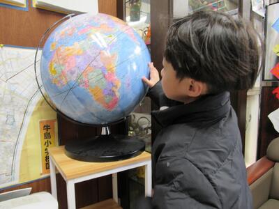 地球儀で、日本の位置や外国の国名と位置を調べていけるといいですね。