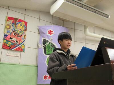 担当の先生と1年生たちから、冬休み中の生活についてのお話です。
