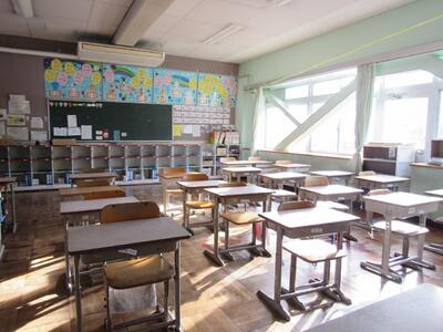 教室内は、子供たちが移動教室で不在にしているかのように、机が整っています。