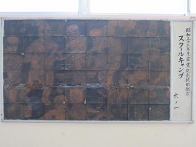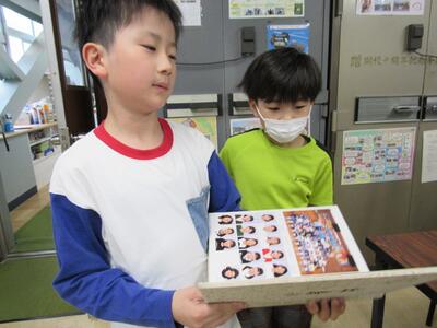 「校長先生、1枚目が完成です。」 「大きく書けていて、いいですね。」
