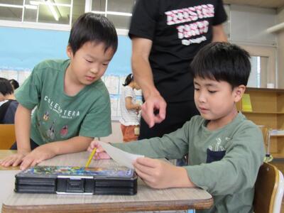 「ぼくも、1枚目が終わりました。」 「大きくどうどうと書けているね。」