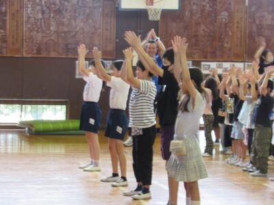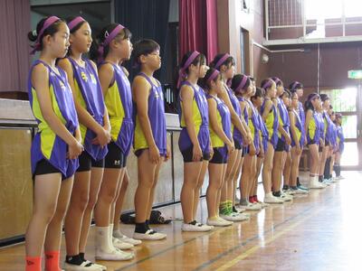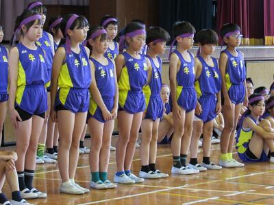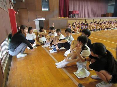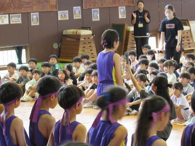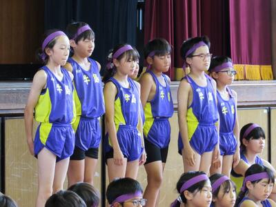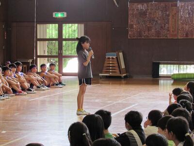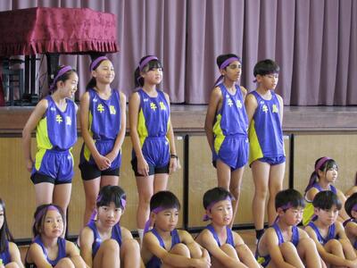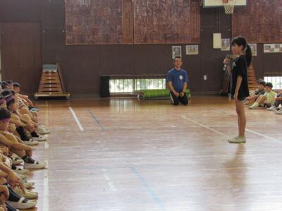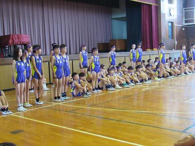 全校児童が体育館に集合し、代表選手たちにエールを送ります。